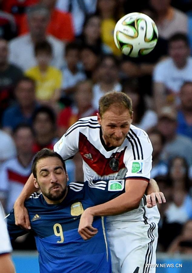 Argentina's Gonzalo Higuain (L) competes for a header with Germany's Benedikt Howedes during the final match between Germany and Argentina of 2014 FIFA World Cup at the Estadio do Maracana Stadium in Rio de Janeiro, Brazil, on July 13, 2014. (Xinhua/Liu Dawei)