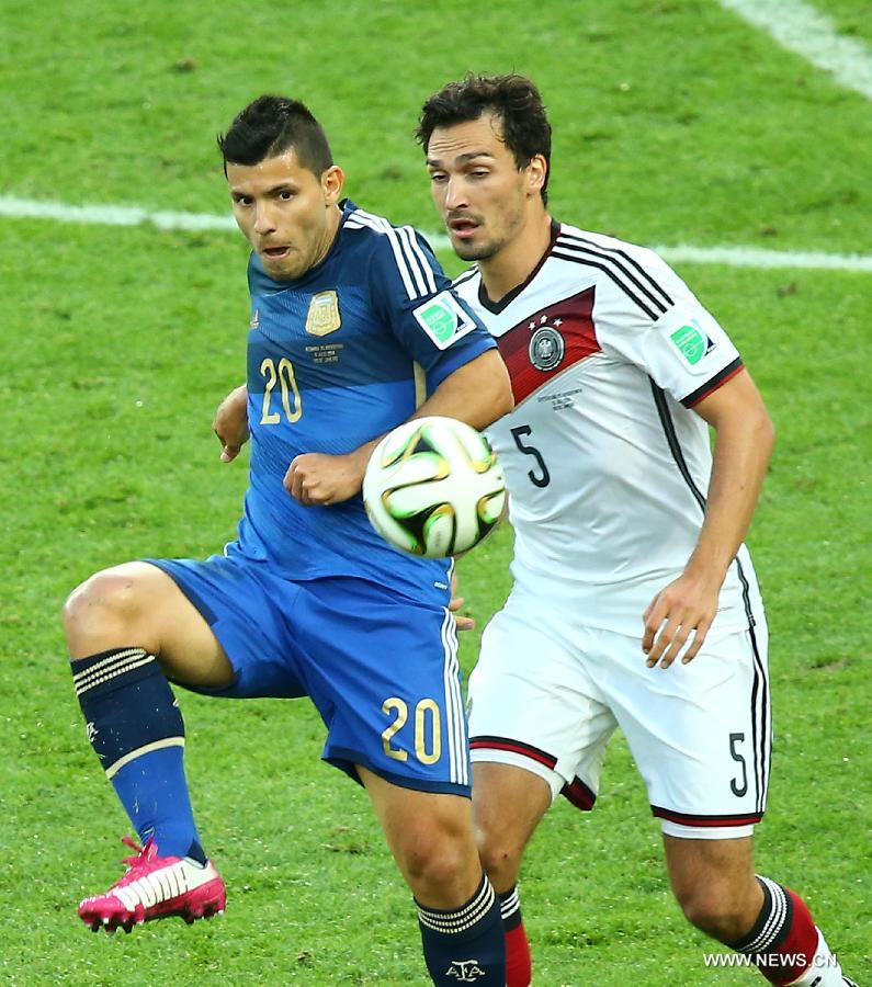 Germany's Mats Hummels vies with Argentina's Sergio Aguero during the final match between Germany and Argentina of 2014 FIFA World Cup at the Estadio do Maracana Stadium in Rio de Janeiro, Brazil, on July 13, 2014. (Xinhua/Chen Jianli)