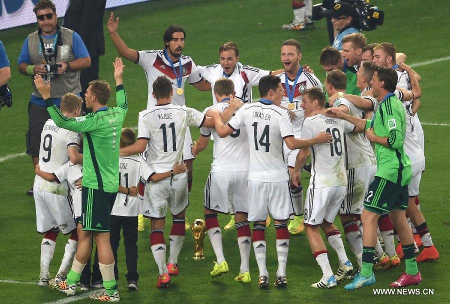 Germany's players celebrate around the FIFA World Cup trophy after the final match between Germany and Argentina of 2014 FIFA World Cup at the Estadio do Maracana Stadium in Rio de Janeiro, Brazil, on July 13, 2014. Germany won 1-0 over Argentina after 120 minutes and took its fourth World Cup title on Sunday. (Xinhua/Liu Dawei)