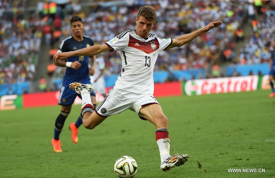 Germany's Thomas Muller passes the ball during the final match between Germany and Argentina of 2014 FIFA World Cup at the Estadio do Maracana Stadium in Rio de Janeiro, Brazil, on July 13, 2014. (Xinhua/Guo Yong)