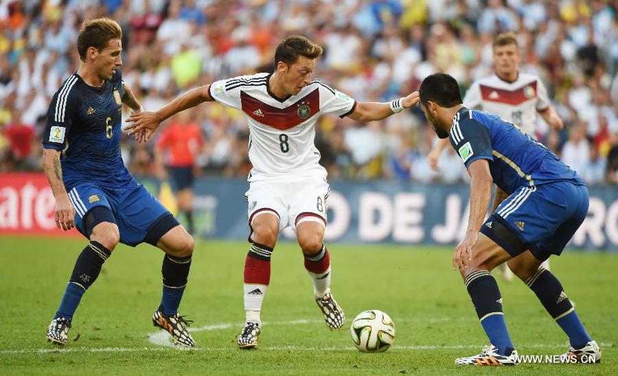 Germany's Mesut Ozil (C) controls the ball during the final match between Germany and Argentina of 2014 FIFA World Cup at the Estadio do Maracana Stadium in Rio de Janeiro, Brazil, on July 13, 2014. (Xinhua/Guo Yong)