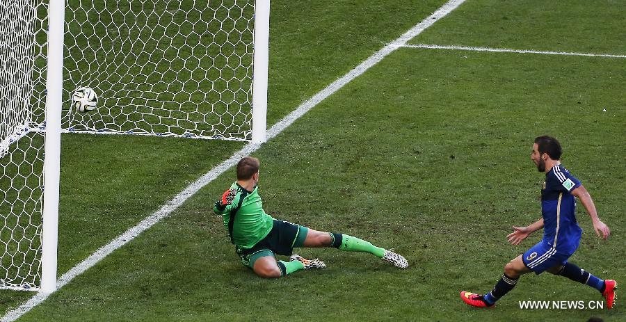 Argentina's Gonzalo Higuain (R) scores a goal which is later nullified for his offside foul during the final match between Germany and Argentina of 2014 FIFA World Cup at the Estadio do Maracana Stadium in Rio de Janeiro, Brazil, on July 13, 2014. (Xinhua/Zhou Lei)