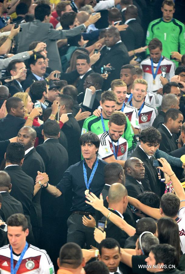 Germany's coach Joachim Loew walks towards the podium with his players after the final match between Germany and Argentina of 2014 FIFA World Cup at the Estadio do Maracana Stadium in Rio de Janeiro, Brazil, on July 13, 2014. Germany won 1-0 over Argentina after 120 minutes and took its fourth World Cup title on Sunday. (Xinhua/Liu Dawei)