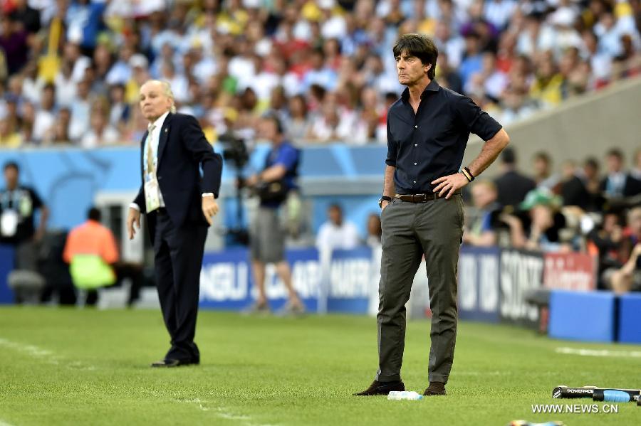 Germany's coach Joachim Loew (R) looks on during the final match between Germany and Argentina of 2014 FIFA World Cup at the Estadio do Maracana Stadium in Rio de Janeiro, Brazil, on July 13, 2014. (Xinhua/Qi Heng)