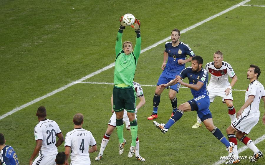 Germany's goalkeeper Manuel Neuer (C) grabs the ball as Argentina's Ezequiel Garay (No.2) goes for a header during the final match between Germany and Argentina of 2014 FIFA World Cup at the Estadio do Maracana Stadium in Rio de Janeiro, Brazil, on July 13, 2014. (Xinhua/Liao Yujie)