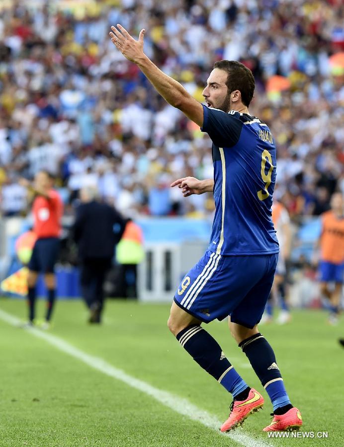 Argentina's Gonzalo Higuain reacts after his goal being nullified by the referee during the final match between Germany and Argentina of 2014 FIFA World Cup at the Estadio do Maracana Stadium in Rio de Janeiro, Brazil, on July 13, 2014. (Xinhua/Qi Heng)