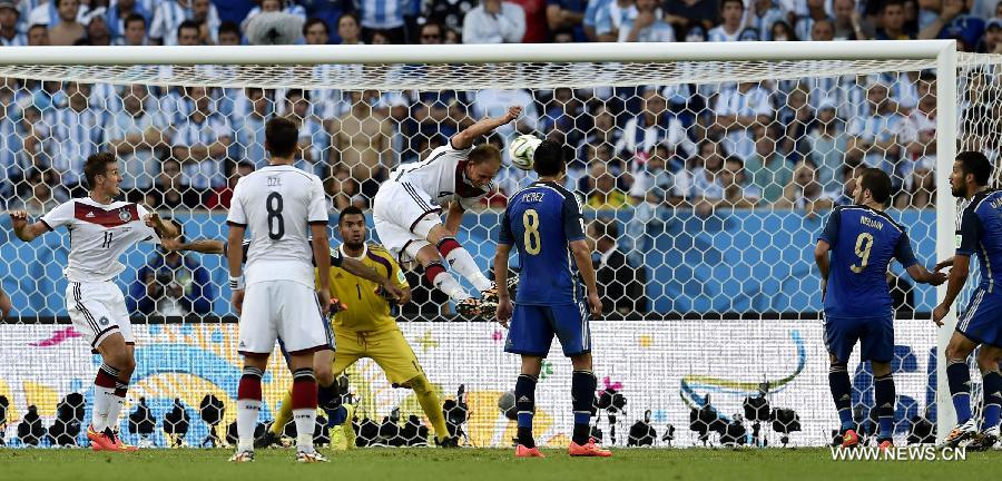 Germany's Benedikt Howedes (4th L) heads the ball during the final match between Germany and Argentina of 2014 FIFA World Cup at the Estadio do Maracana Stadium in Rio de Janeiro, Brazil, on July 13, 2014. (Xinhua/Qi Heng)