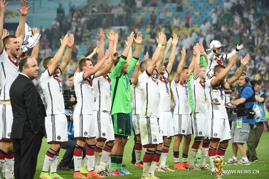 Germany's players applaud fans as the FIFA World Cup trophy is seen placed in front of them after the final match between Germany and Argentina of 2014 FIFA World Cup at the Estadio do Maracana Stadium in Rio de Janeiro, Brazil, on July 13, 2014. Germany won 1-0 over Argentina after 120 minutes and took its fourth World Cup title on Sunday. (Xinhua/Liu Dawei)