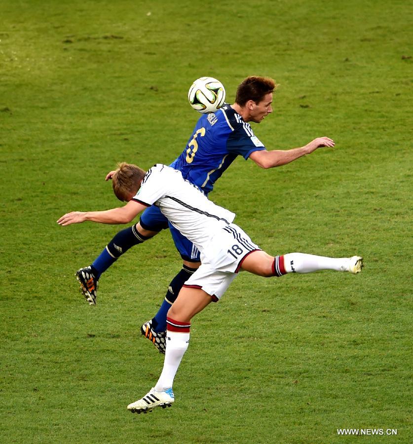 Germany's Toni Kroos vies with Argentina's Lucas Biglia during the final match between Germany and Argentina of 2014 FIFA World Cup at the Estadio do Maracana Stadium in Rio de Janeiro, Brazil, on July 13, 2014. (Xinhua/Li Ga)