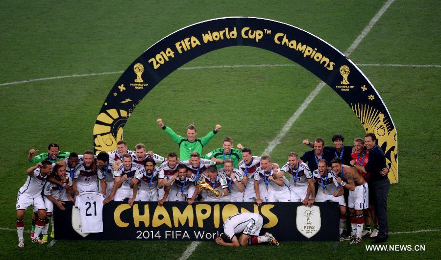 Germany's players pose with the World Cup trophy after the final match between Germany and Argentina of 2014 FIFA World Cup at the Estadio do Maracana Stadium in Rio de Janeiro, Brazil, on July 13, 2014. Germany won 1-0 over Argentina after 120 minutes and took its fourth World Cup title on Sunday. (Xinhua/Li Ga)