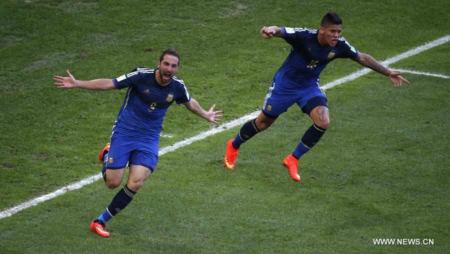 Argentina's Gonzalo Higuain (L) celebrates after scoring a goal which is later nullified for his offside foul during the final match between Germany and Argentina of 2014 FIFA World Cup at the Estadio do Maracana Stadium in Rio de Janeiro, Brazil, on July 13, 2014. (Xinhua/Liao Yujie)