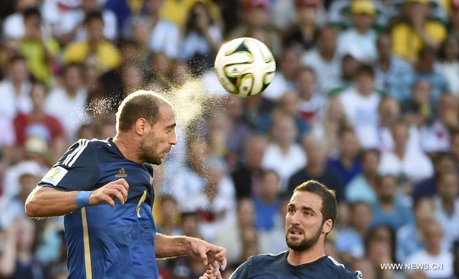 Argentina's Pablo Zabaleta (L) heads the ball during the final match between Germany and Argentina of 2014 FIFA World Cup at the Estadio do Maracana Stadium in Rio de Janeiro, Brazil, on July 13, 2014. (Xinhua/Yang Lei)