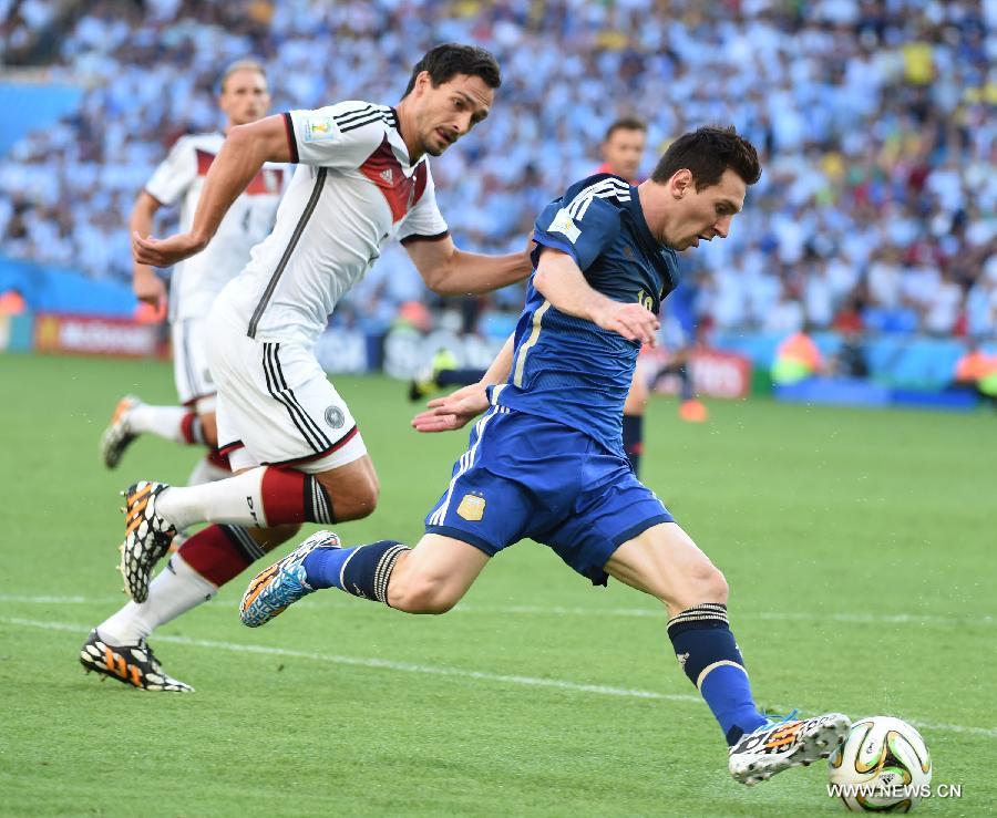 Argentina's Lionel Messi (R) runs with the ball during the final match between Germany and Argentina of 2014 FIFA World Cup at the Estadio do Maracana Stadium in Rio de Janeiro, Brazil, on July 13, 2014. (Xinhua/Liu Dawei)