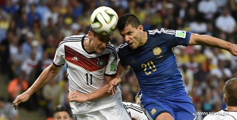 Germany's Miroslav Klose (L) competes for a header with Argentina's Sergio Aguero during the final match between Germany and Argentina of 2014 FIFA World Cup at the Estadio do Maracana Stadium in Rio de Janeiro, Brazil, on July 13, 2014. (Xinhua/Yang Lei)