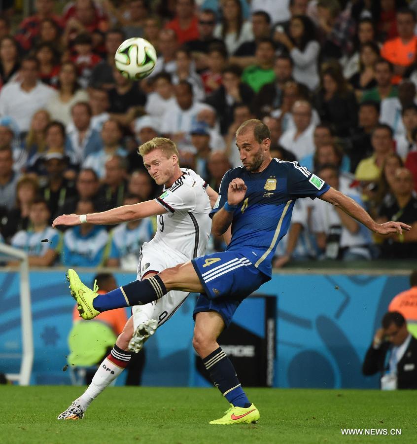 Argentina's Pablo Zabaleta (R) vies with Germany's Andre Schuerrle during the final match between Germany and Argentina of 2014 FIFA World Cup at the Estadio do Maracana Stadium in Rio de Janeiro, Brazil, on July 13, 2014. (Xinhua/Liu Dawei)