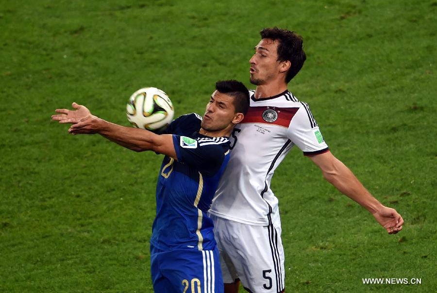 Germany's Mats Hummels vies with Argentina's Sergio Aguero during the final match between Germany and Argentina of 2014 FIFA World Cup at the Estadio do Maracana Stadium in Rio de Janeiro, Brazil, on July 13, 2014. (Xinhua/Li Ga)
