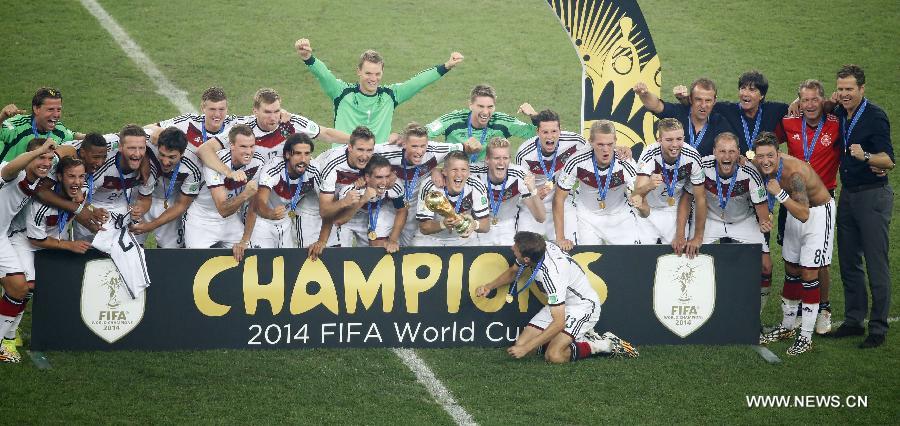 Germany's players pose with the World Cup trophy after the final match between Germany and Argentina of 2014 FIFA World Cup at the Estadio do Maracana Stadium in Rio de Janeiro, Brazil, on July 13, 2014. Germany won 1-0 over Argentina after 120 minutes and took its fourth World Cup title on Sunday. (Xinhua/Liao Yujie)