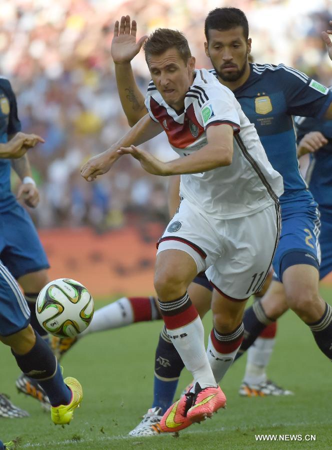 Germany's Miroslav Klose (front) breaks through during the final match between Germany and Argentina of 2014 FIFA World Cup at the Estadio do Maracana Stadium in Rio de Janeiro, Brazil, on July 13, 2014. (Xinhua/Guo Yong)
