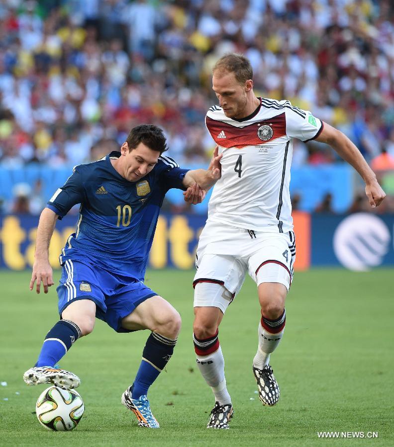 Argentina's Lionel Messi (L) controls the ball against Germany's Benedikt Howedes during the final match between Germany and Argentina of 2014 FIFA World Cup at the Estadio do Maracana Stadium in Rio de Janeiro, Brazil, on July 13, 2014. (Xinhua/Liu Dawei)