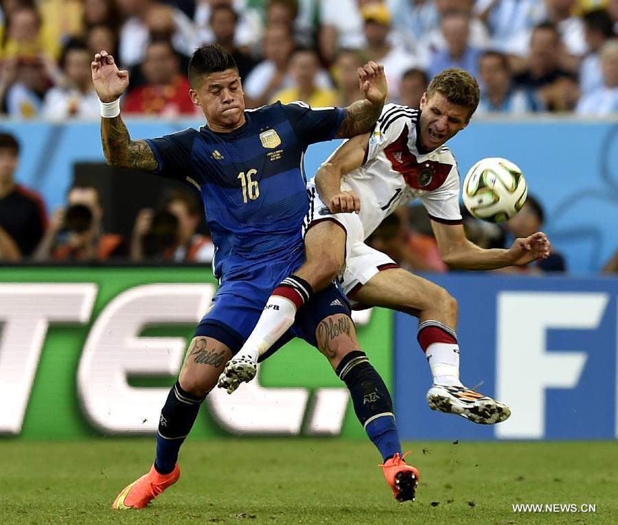 | Germany's Thomas Muller (R) vies with Argentina's Marcos Rojo during the final match between Germany and Argentina of 2014 FIFA World Cup at the Estadio do Maracana Stadium in Rio de Janeiro, Brazil, on July 13, 2014. (Xinhua/Qi Heng) |