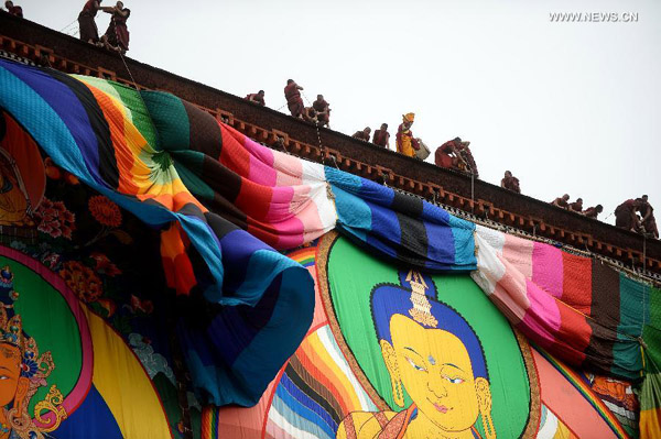 Tibetan Buddhist monks prepare for a Thangka worship activity at the Tashilhunpo Monastery in Xigaze, southwest China's Tibet Autonomous Region, July 13, 2014. The Tashilhunpo Monastery, the traditional seat of the Panchen Lama lineage, holds a three-day Thangka worship activity annually between the 14th and 16th days of the fifth Tibetan lunar month. Tens of thousands of Gelug School Buddhist believers will attend the activity, during which they pray for auspices while worshipping three large-scale Thangkas portraying discrete Buddhas. (Xinhua/Jin Liangkuai)