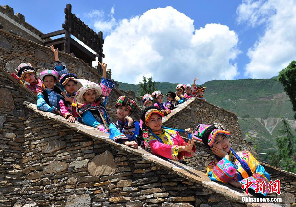 On July 12, 2014, the national fitness team members dressed in the traditional costumes of Qiang girls show both traditional and modern beauty in the run-up to Hong Kong Federation of Bodybuilding and Fitness (HKFBF) International Bodybuilding and Fitness Invitation Championship. (Chinanews.com/ An Yuan)