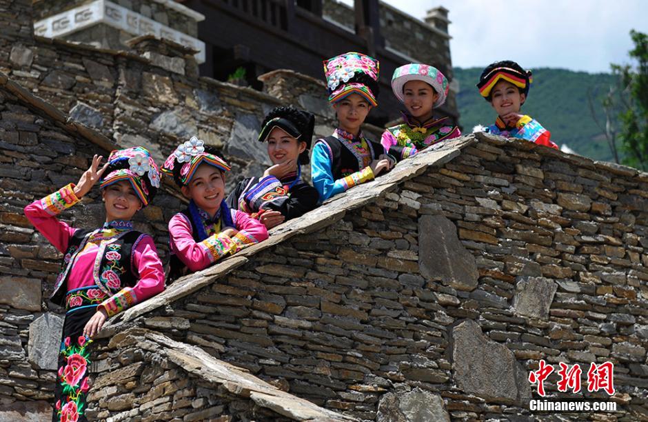 On July 12, 2014, the national fitness team members dressed in the traditional costumes of Qiang girls show both traditional and modern beauty in the run-up to Hong Kong Federation of Bodybuilding and Fitness (HKFBF) International Bodybuilding and Fitness Invitation Championship. (Chinanews.com/ An Yuan)