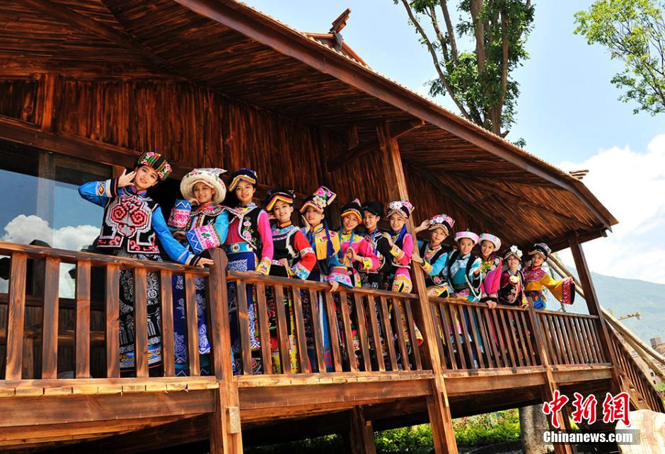 On July 12, 2014, the national fitness team members dressed in the traditional costumes of Qiang girls show both traditional and modern beauty in the run-up to Hong Kong Federation of Bodybuilding and Fitness (HKFBF) International Bodybuilding and Fitness Invitation Championship. (Chinanews.com/ An Yuan)