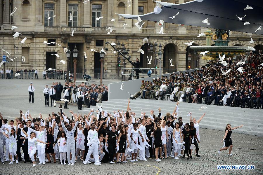 | People release pigeons during the annual Bastille Day military parade in Paris on July 14, 2014. France has issued an unprecedented invitation to more than 70 countries involved in World War I to take part in its annual Bastille Day military parade. (Xinhua/Etienne Laurent) |