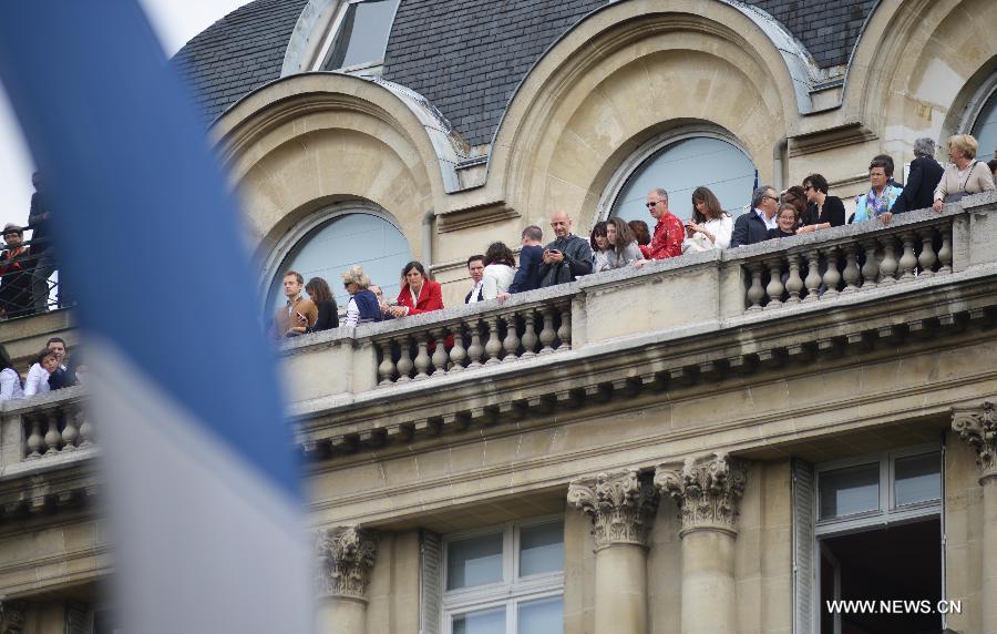 People watch the annual Bastille Day military parade at a balcony of a building on the Champs Elysees Avenue in Paris, France, on July 14, 2014. France celebrated National Day with a grand parade, which was participated by troops from 80 nations. (Xinhua/Li Genxing)