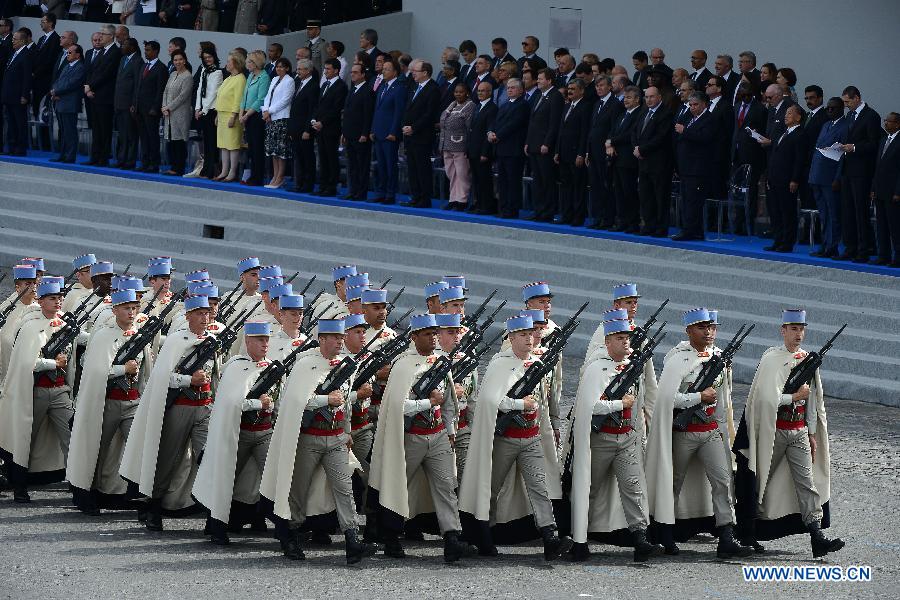 French foreign legion attends the annual Bastille Day military parade in Paris on July 14, 2014. France has issued an unprecedented invitation to more than 70 countries involved in World War I to take part in its annual Bastille Day military parade. (Xinhua/Etienne Laurent)