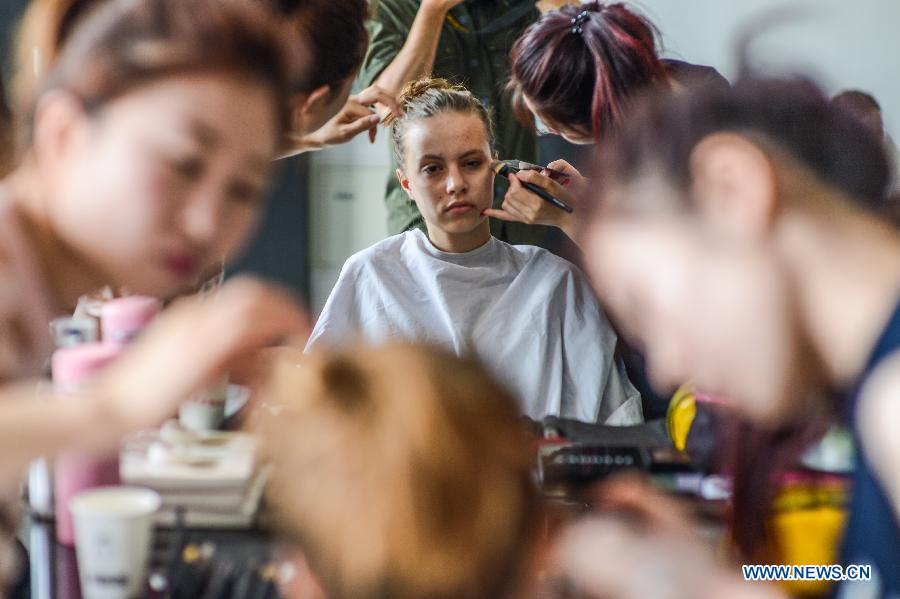 Slovakian model Patricia gets makeups applied in Puyuan Township of Tongxiang City, east China's Zhejiang Province, July 14, 2014. As a junior model, she is paid 2,000 RMB yuan (322 U.S dollars) per day. With the booming development of woollen garment industry in Puyuan, many foreigners were attracted here and work as fashion models to earn their living. At present, over 100 foreigners are active models in the township, who come from at least 20 countries. In 2013, the annual turnover of woollen garment in Puyuan reached 23 billion RMB yuan (3.71 billion U.S. dollars), accounting for 60 percent of the market nationwide. (Xinhua/Xu Yu)