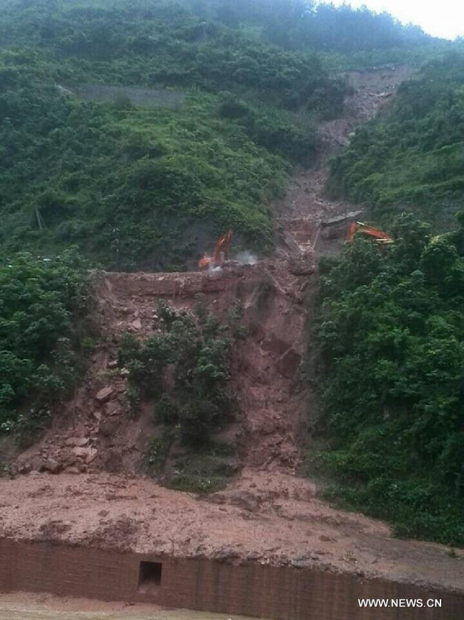 Photo taken by a mobile phone shows the mudslide in Xinzhan Township, Tongzi County, southwest China's Guizhou Province, July 15, 2014. A rain-triggered landslide on Monday affected train services between Guizhou and Sichuan provinces. Fourteen trains were canceled after the landslide hit the railway section between the stations of Taibai and Mengdu in the city of Zunyi. (Xinhua/Jiang Longrong)