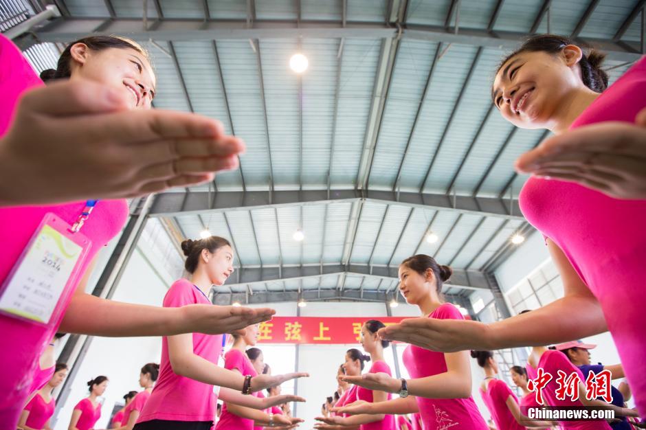 Volunteers for the 2014 Nanjing Youth Olympic Games receive training on July 13, 2014. On July 13, 491 ceremony volunteers for the 2014 Nanjing Youth Olympic Games make public appearance. All of them are from 18 colleges including Southeast University, Nanjing Agriculture University and Nanjing Sport Institute. (CNS/Yang Bo)