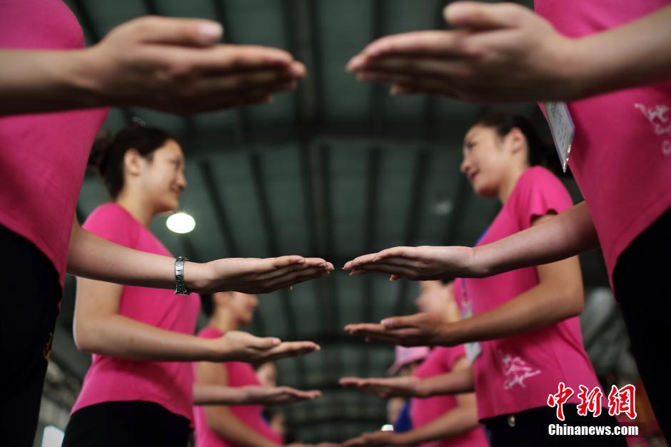 Volunteers for the 2014 Nanjing Youth Olympic Games receive training on July 13, 2014. On July 13, 491 ceremony volunteers for the 2014 Nanjing Youth Olympic Games make public appearance. All of them are from 18 colleges including Southeast University, Nanjing Agriculture University and Nanjing Sport Institute. (CNS/Yang Bo)