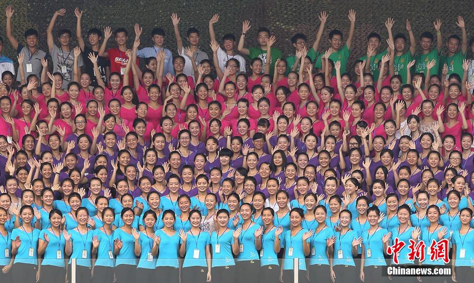 Volunteers for the 2014 Nanjing Youth Olympic Games pose for a group photo on July 13, 2014. On July 13, 491 ceremony volunteers for the 2014 Nanjing Youth Olympic Games make public appearance. All of them are from 18 colleges including Southeast University, Nanjing Agriculture University and Nanjing Sport Institute. (CNS/Yang Bo)