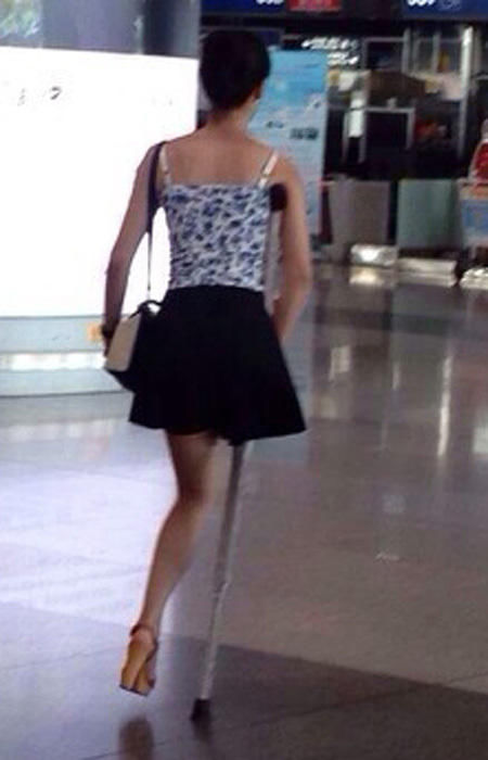On July 8, 2014, a netizen put the photos of a one-legged woman wearing high heel at the Beijing airport on the Internet, with comment "What a beautiful girl!"