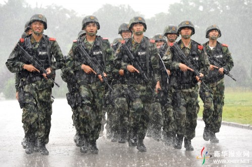 On July 12, 2014, soldiers of the People's Armed Police Force receive training in the rain in Nanjing, east China's Jiangsu Province. The training aims to temper their willpower and help them make good preparations for the security work of the Nanjing 2014 Youth Olympic Games. (Photo/XHBY.NET)
