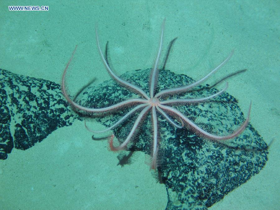 Photo taken on July 16, 2014 shows a starfish encountered with Jiaolong, China's first manned deep-sea submersible, in the northwest Pacific Ocean. The submersible has launched a voyage in the northwest Pacific Ocean, during which it will research cobalt-rich crusts and life forms inhabiting the bottom of the sea. (Xinhua/China Ocean Mineral Resources R&D Association)