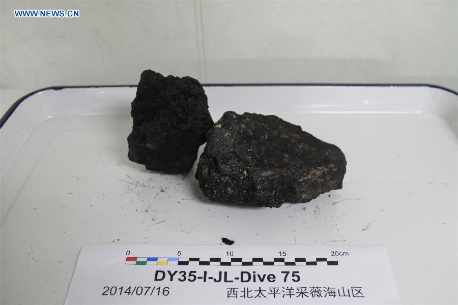 Photo taken on July 16, 2014 shows Cobalt-rich crusts collected by Jiaolong, China's first manned deep-sea submersible, in the northwest Pacific Ocean, July 16, 2014. The submersible has launched a voyage in the northwest Pacific Ocean, during which it will research cobalt-rich crusts and life forms inhabiting the bottom of the sea. (Xinhua/Luo Sha)