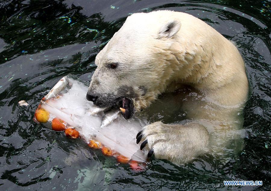 Polar bear Tonki enjoys food at the Everland Amusement Park in Yongin, Gyeonggi province, Korea, July 17, 2014. The polar bear is given special iced treats by zoo keepers during the hot summer. (Xinhua/Park Jin-hee)