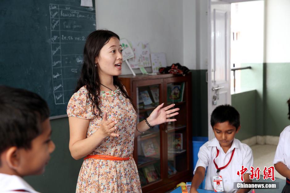 Photo taken on July 15, 2014 shows Chinese teacher Li Panpan teaching a class in Kathmandu, Nepal. (Photo/Chinanews.com)