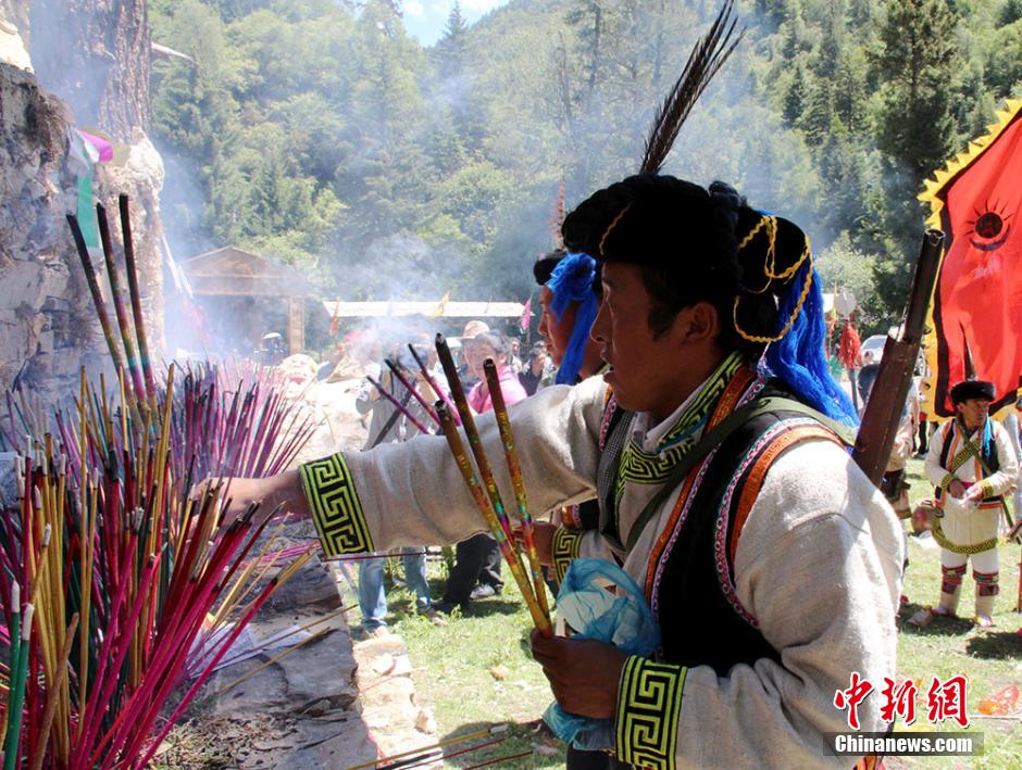 Qiang people hold a solemn ceremony of mountain offer on June 6 of the lunar calendar, praying for good weather and thanking God for blessing respectively in Mao county, Sichuan. The sacrifice event will last till June 27 in lunar calendar. (CNS/ He Qinghai)