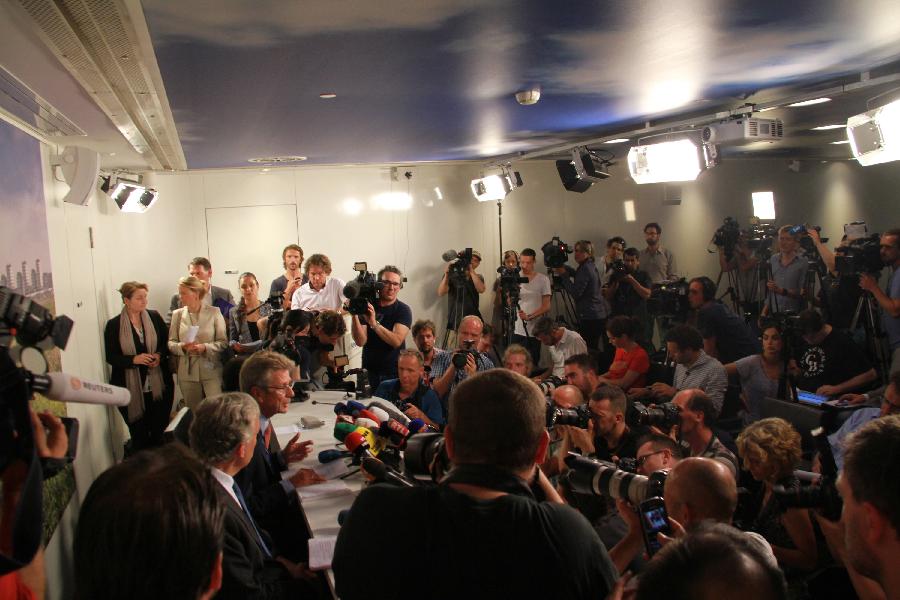European Director of Malaysia Airlines Huib Gorter speaks at a press conference at the Schiphol Airport in Amsterdam, the Netherlands, on July 17, 2014. Dutch Prime Minister Mark Rutte said on Thursday that dozens of Dutch citizens might have been killed in the Malaysian passenger crash over the eastern part of Ukraine. (Xinhua/Pan Zhi)