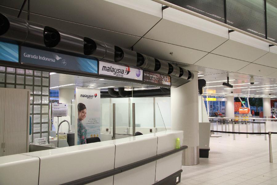 | Photo taken on July 17, 2014 shows the counter of Malaysia Airlines at the Schiphol Airport in Amsterdam, the Netherlands. Dutch Prime Minister Mark Rutte said on Thursday that dozens of Dutch citizens might have been killed in the Malaysian passenger crash over the eastern part of Ukraine. (Xinhua/Pan Zhi) |