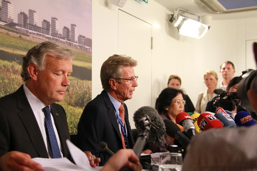 European Director of Malaysia Airlines Huib Gorter (2nd L) speaks at a press conference at the Schiphol Airport in Amsterdam, the Netherlands, on July 17, 2014. Dutch Prime Minister Mark Rutte said on Thursday that dozens of Dutch citizens might have been killed in the Malaysian passenger crash over the eastern part of Ukraine. (Xinhua/Pan Zhi)