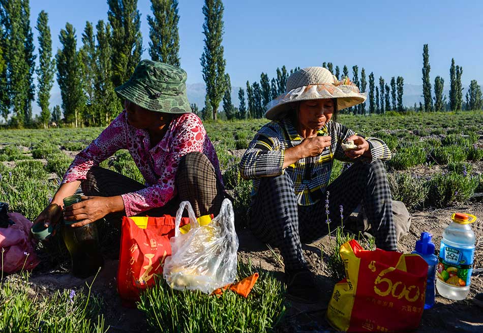 Farmers eat breakfast by the lavender field. (Photo/Xinhua)