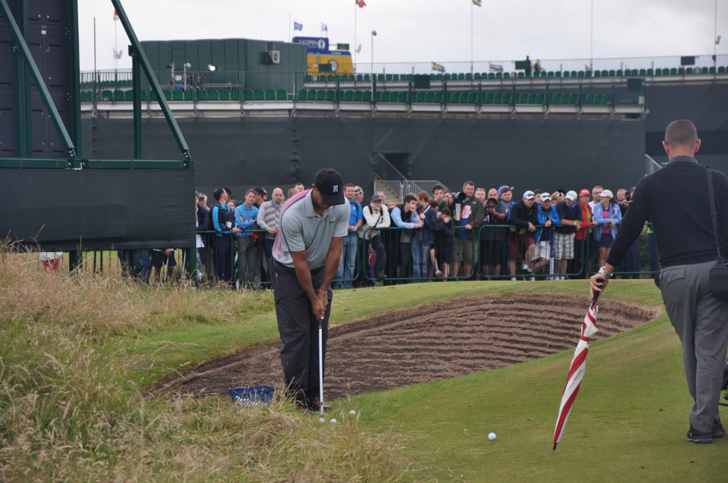 Tiger Woods chips on the 18th on practice day. In Round 1 he found himself in the bunker (Photo/David Ferguson)