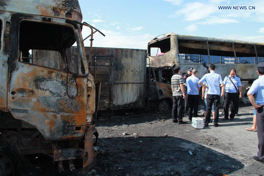 Resucers work at the site of a traffic accident on a section of the Hukun (Shanghai to Kunming) Expressway in central China's Hunan Province, July 19, 2014. At least 38 people are confirmed dead and another five injured after a vehicle crash triggered fire and explosion on the highway early Saturday morning, police said. (Xinhua/Zeng Yong)