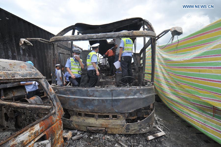 Resucers work at the site of a traffic accident on a section of the Hukun (Shanghai to Kunming) Expressway in central China's Hunan Province, July 19, 2014. At least 38 people are confirmed dead and another five injured after a vehicle crash triggered fire and explosion on the highway early Saturday morning, police said. (Xinhua/Long Hongtao)